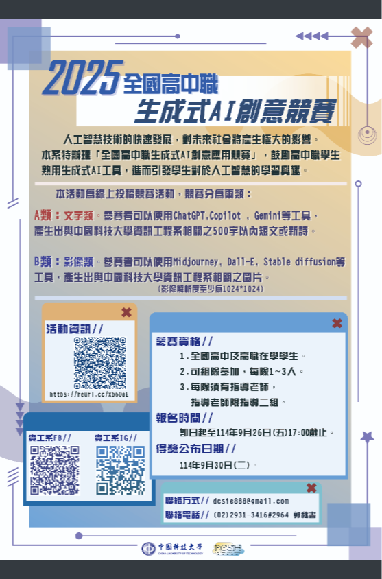 一、人工智慧技術的快速發展,對未來社會將產生極大的影響。中國科技大學資訊工程系特辦理「2025全國高中職生成式AI創意應用競賽」,鼓勵高中及高職學生熟用生成式AI工具,進而引發學生對於人工智慧的學習興趣。