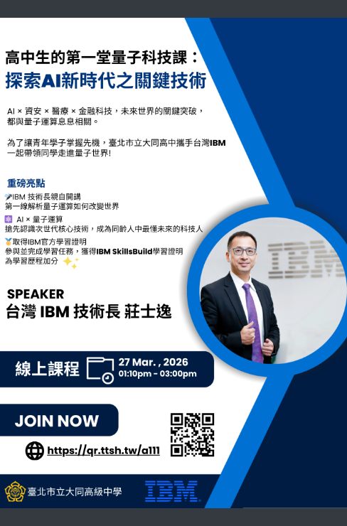四、活動資訊(一)主題:高中生的第一堂量子科技課:探索AI新時代之關鍵技術(二)時間:115年3月27日(星期五)13:10-14:00(三)地點:大同高中(本校學生實體)+他校線上同步辦理(四)講者:台灣IBM技術長莊士逸(Steve Chuang)(五)指定學習單元:IBM SkillsBuild 什麼是量子計算?https://students.yourlearning.ibm.com/activity/URL-318AEE2213A2(六)線上講座報名表單連結:https://qr.ttsh.tw/a111;講座當日(3月27日,星期五)之線上連結,將另以電子郵件寄送。