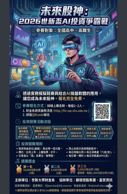 主旨:檢送本校辦理「未來股神:2026世新盃AI投資爭霸戰」競賽規則及電子海報,敬請貴校公告並鼓勵同學踴躍參加,請查照。