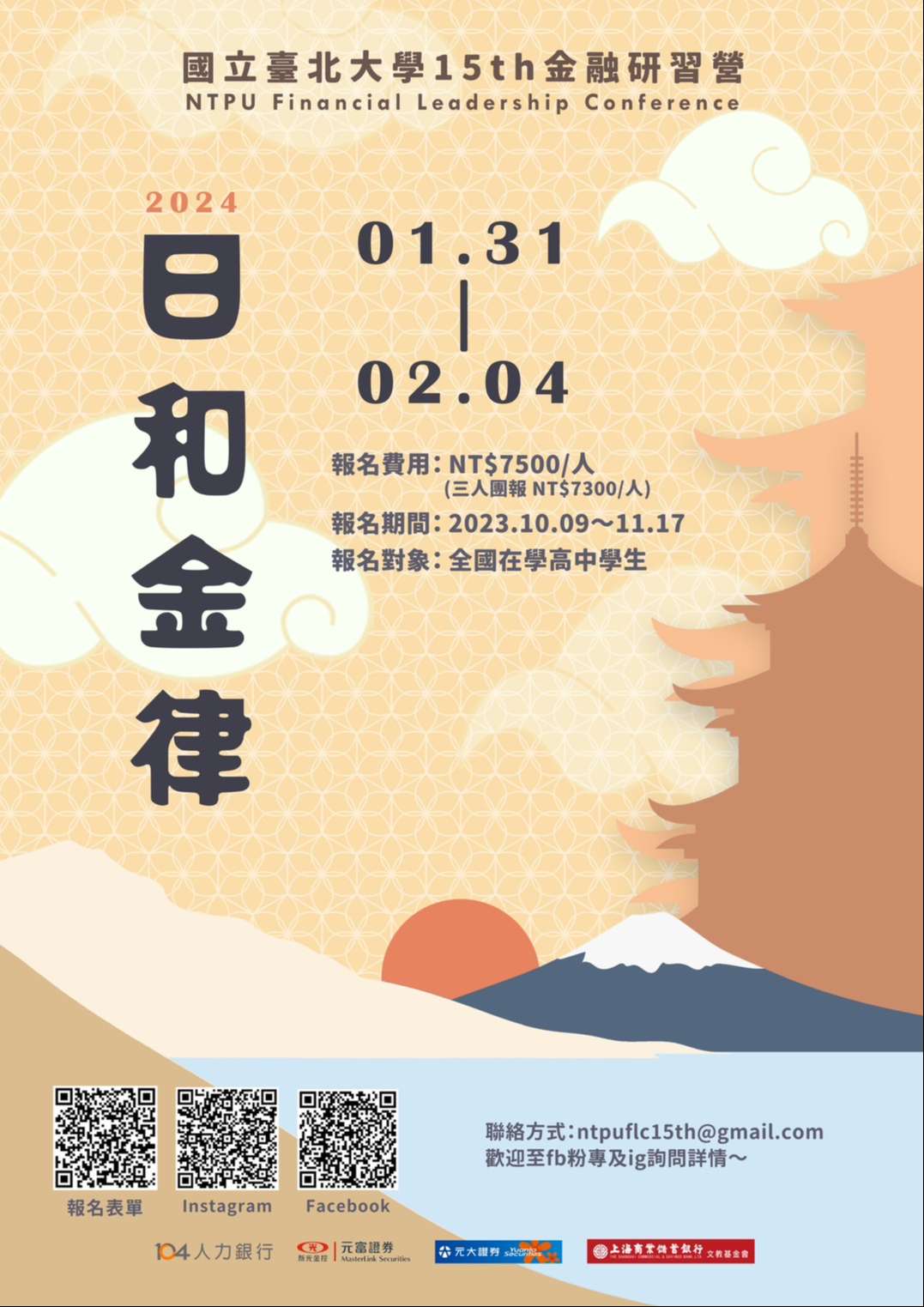 三、敬請協助公告本校金融研習營資訊於貴校大學營隊資訊。如對本系金融研習營有任何疑問,可參考國立台北大學金融研習營Facebook粉專https://www.facebook.com/ntpufcm5 Instegram粉專https://instagram.com/2024_ntpu_flc_?igshid=MzRlODBiNWFlZA==,或聯絡本次活動聯絡人:王望宇 0901019186 / 于上哲 0975076986。