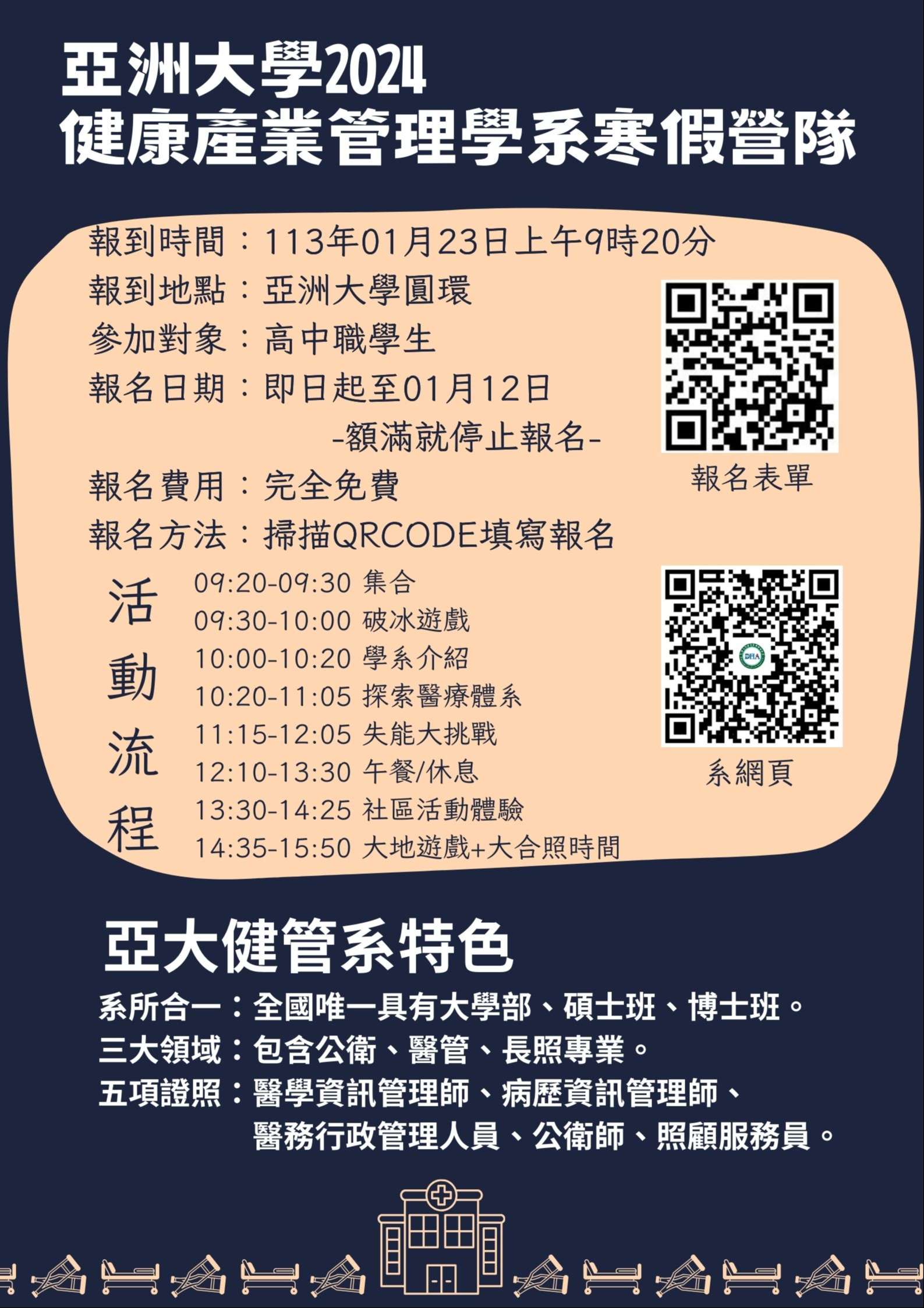主旨:本校健康產業管理學系訂於113年1月23日舉辦2024年健管系寒假營隊,敬邀貴校學生報名參加,請查照。