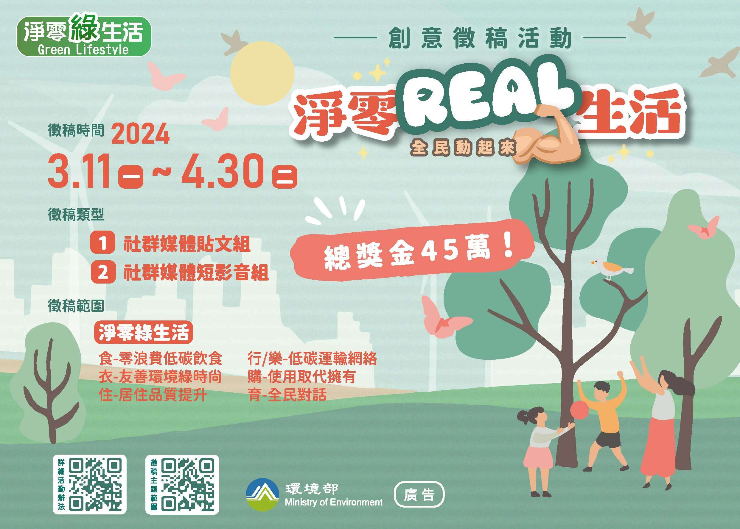 一、為鼓勵社會大眾了解淨零綠生活概念及激發創作靈感,環境部特辦理貼文及主題曲短影音徵稿活動,鼓勵各界報名參加。