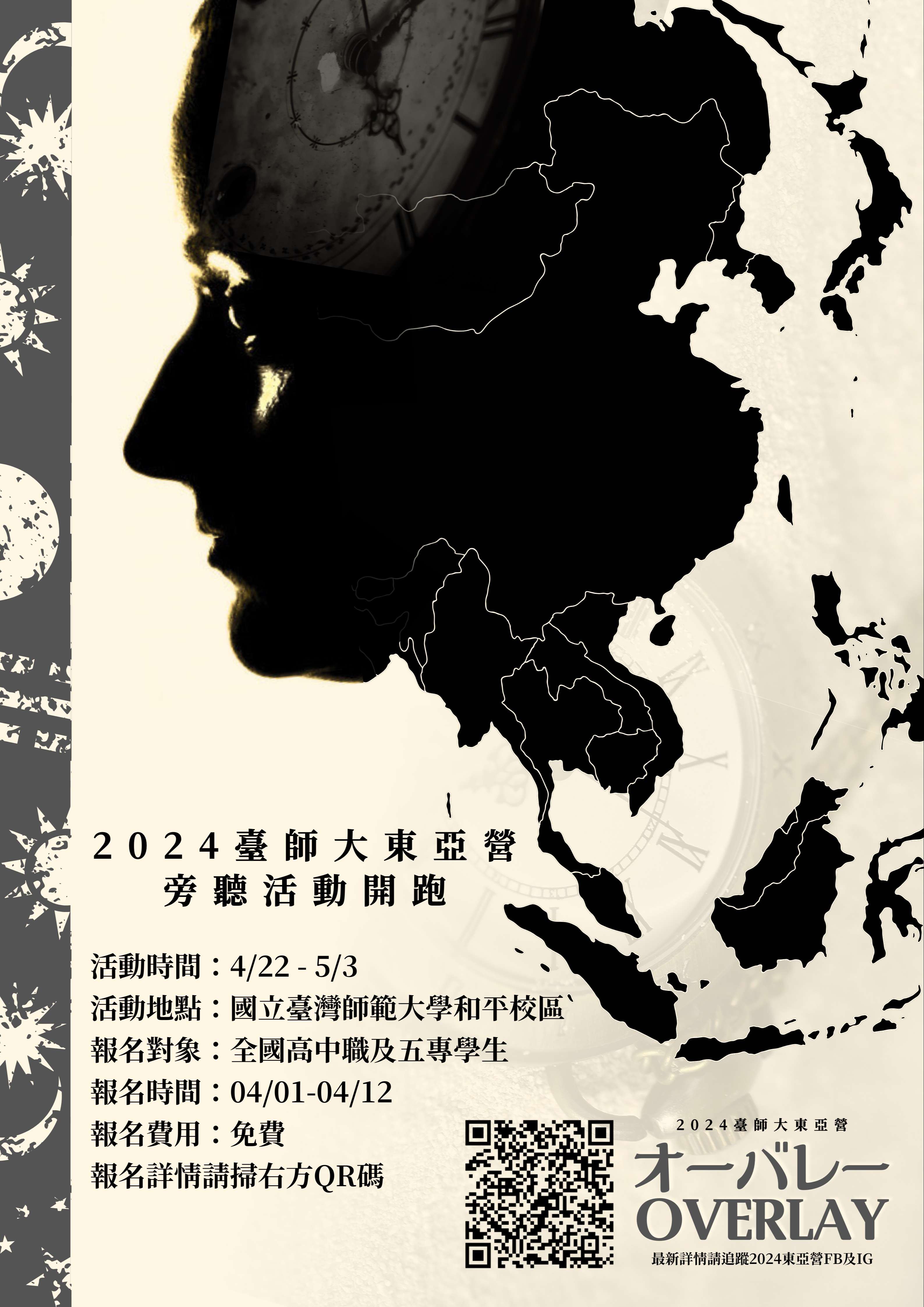 主旨:檢送本校東亞學系系學會舉辦「2024東亞營:校園課程旁聽日」活動資訊,敬請鼓勵貴校學生於113年4月12日前上網報名參加,請查照。