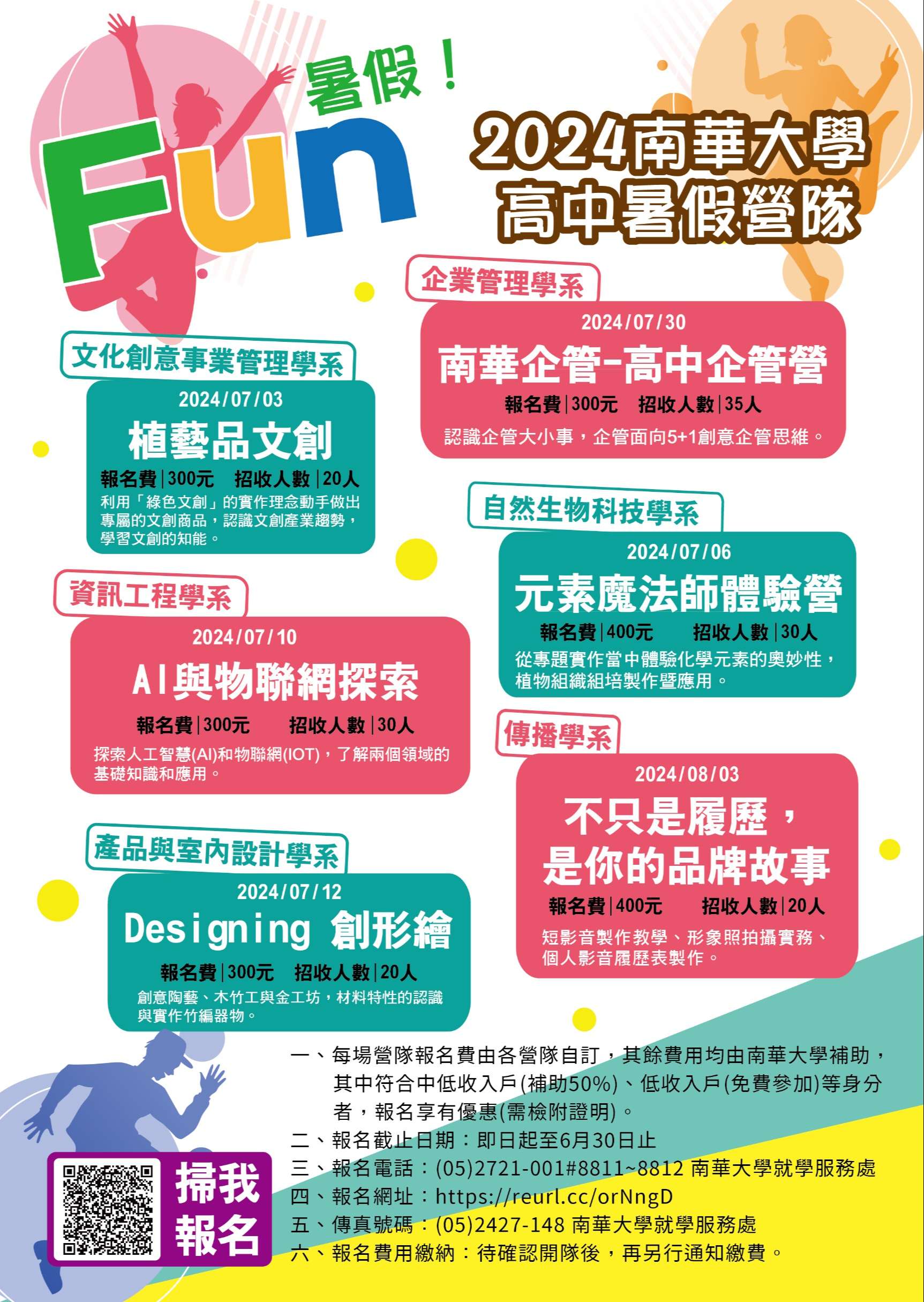 一、為增進高中學生認識大學校系特色及未來升學進路,協助學生自我探索,激發學習興趣,本校於暑假期間開辦各類高中生營隊,內容涵括人文、社會、資訊、管理、藝術等領域,活動多元、內容精彩豐富。敬請轉知貴校同學並鼓勵踴躍報名參加各營隊活動。