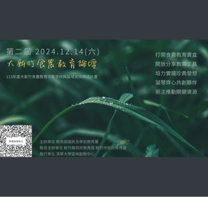 一、本次活動係以區域特色飲食文化、菜市場學校、食農教育示範基地、社區大學食農教育發展經驗、學校午餐結合食農教育等主題,透過案例分享及交流對話,讓學校食農教育朝課程化、在地化、系統化之目標推展,資訊如下: (一)時間:113年12月14日(星期六)上午8時50分至下午5時30分。 (二)地點:國立清華大學教育館3樓310、311教室(新竹市光 復路2段101號)。