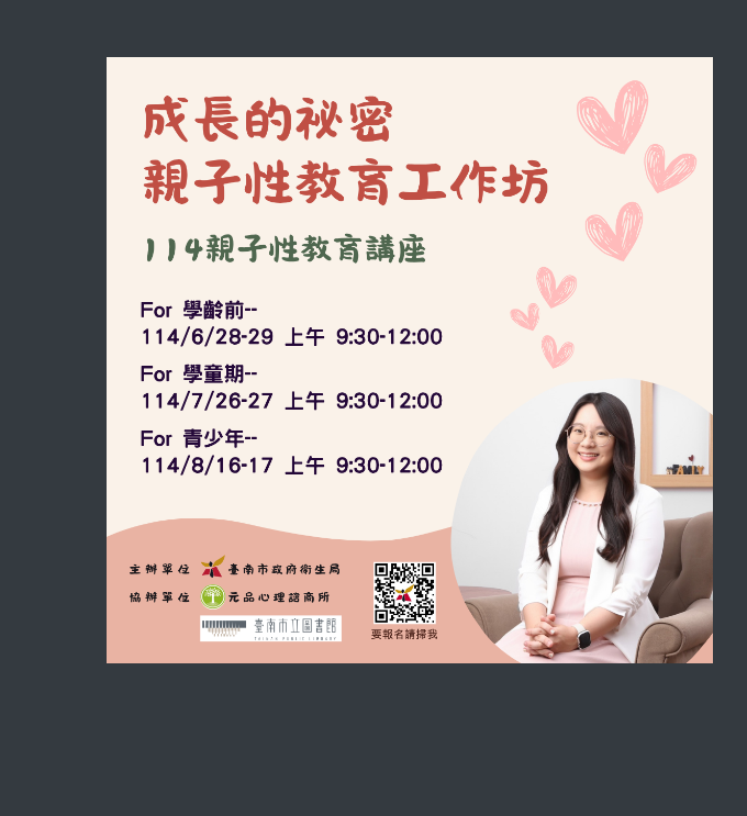 二、活動詳情: (一)活動主講人:元品心理諮商所諮商心理師─蔡于岑心理師 (二)活動地點:臺南市立圖書館永康總館-4F手作教室(台南市永康區康橋大道255號) (三)活動日期: 1、114年6月28-29日上午10時,Part.1學齡前性教育 2、114年7月26-27日上午10時,Part.2學童期性教育 3、114年8月16-17日上午10時,Part.3青春期成長篇(四)報名網址:https://p.tainan.gov.tw//iMkaq2