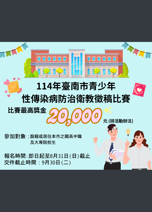 一、比賽目的為藉由本次比賽,徵求青少年性傳染病之衛教宣傳素材,以利後續針對學生族群加強性傳染病之防治,冀 望透過宣導素材建立學生正確性傳染病防治觀念,以有效降低本市年輕族群性病之發生率。