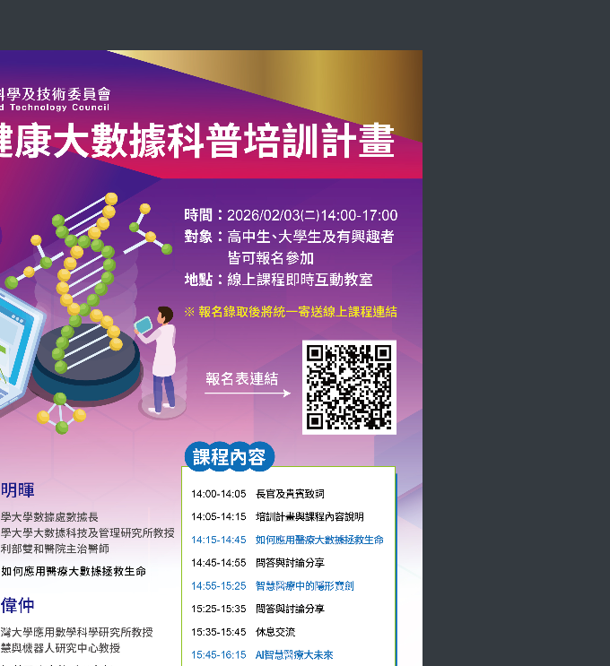 二、兩場科普培訓課程活動擬訂於民國115年02月03日(二) 14:00-17:00辦理健康大數據科普培訓計畫,本場次科普培訓課程活動為線上課程,報名方式亦採線上報名,健康大數據科普培訓計畫報名連結https://forms.gle /bnuEvvEeYyAvJzKx5,請欲報名者參見報名表內詳細資訊並填寫相關內容,報名截止日期為115年01月30日(五),若額滿將提前關閉報名系統。報名成功者將於115年02月01日 (日)前寄發線上課程連結,並邀請加入課程討論群組。