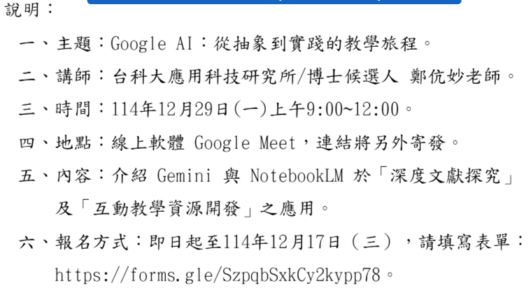 一、主題:Google AI:從抽象到實踐的教學旅程。二、講師:台科大應用科技研究所/博士候選人 鄭伉妙老師。三、時間:114年12月29日(一)上午9:00~12:00。四、地點:線上軟體 Google Meet,連結將另外寄發。五、內容:介紹 Gemini 與 NotebookLM 於「深度文獻探究」及「互動教學資源開發」之應用。六、報名方式:即日起至114年12月17日(三),請填寫表單:https://forms.gle/SzpqbSxkCy2kypp78。一、主題:Google AI:從抽象到實踐的教學旅程。二、講師:台科大應用科技研究所/博士候選人 鄭伉妙老師。三、時間:114年12月29日(一)上午9:00~12:00。四、地點:線上軟體 Google Meet,連結將另外寄發。五、內容:介紹 Gemini 與 NotebookLM 於「深度文獻探究」及「互動教學資源開發」之應用。六、報名方式:即日起至114年12月17日(三),請填寫表單:https://forms.gle/SzpqbSxkCy2kypp78。