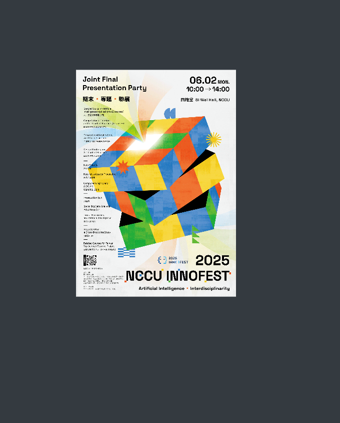 一、為推動人工智慧之跨領域發展與應用,本校人工智慧跨域研究中心(AI中心)將於6月2日辦理「2025 NCCUInnofest (113-2學期課程期末海報聯展),邀集本校14門和人工智慧跨域相關課程和國立中央大學專題課程進行成果展出,本次聯展亦邀集企業到場觀展,期藉由成果交流,促進跨域合作與創新實踐,誠摯歡迎師生及各界人士蒞臨。