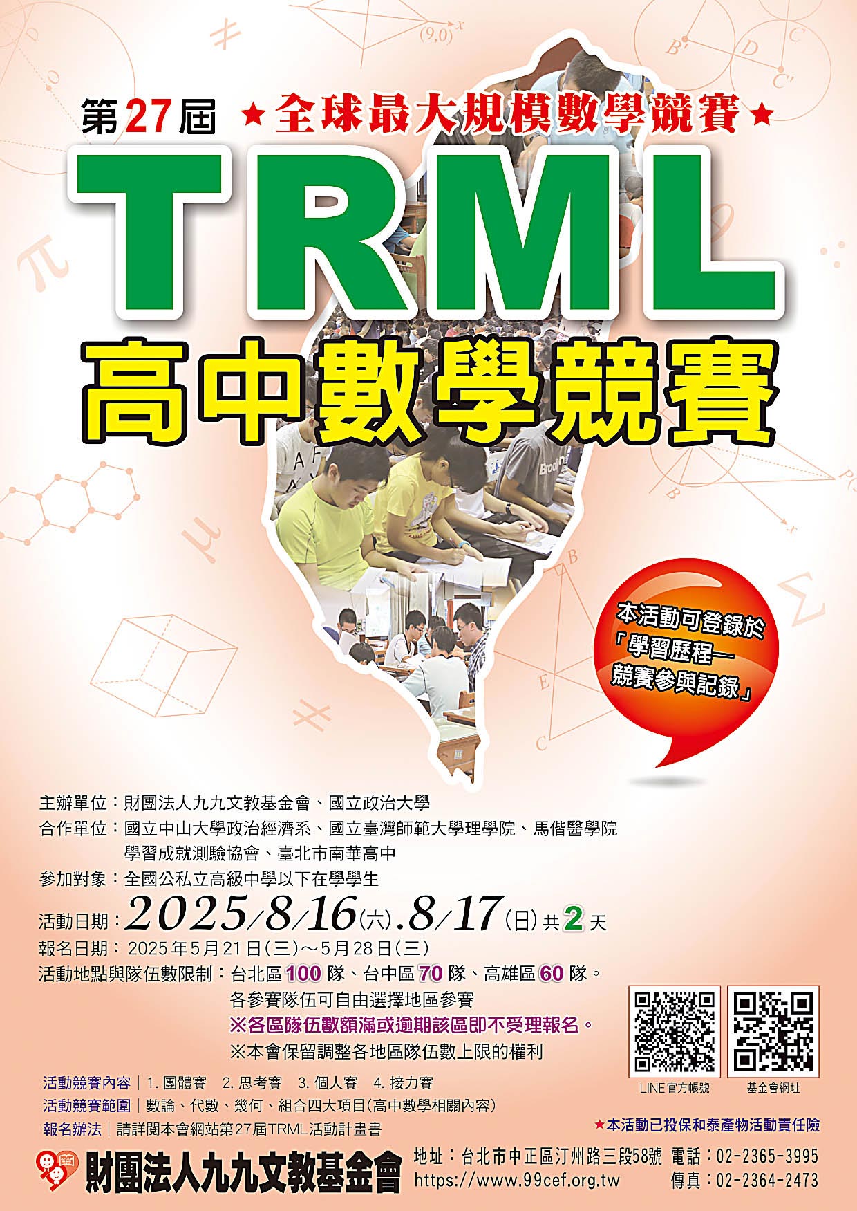 二、參加對象:全國公私立高級中學暨職業學校以下(含)在學學生。 三、報名時間:民國114年5月21日(星期三)上午10:00起至5月28日(星期三),各地區參賽伍數額滿或逾期即不再受理報名。