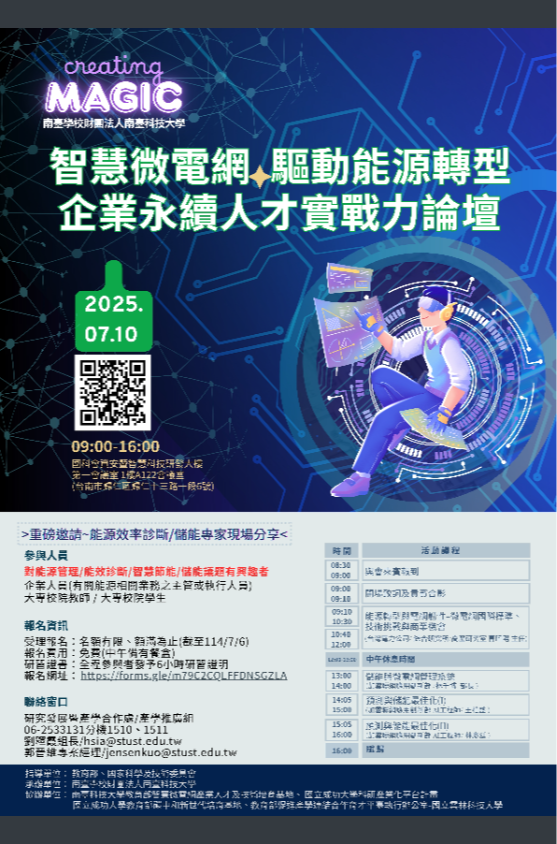 主旨:有關本校推動教育部育才平臺任務協助南臺科技大學辦理「2025智慧電網驅動能源轉型:企業永續人才實戰力論壇」,敬邀貴校教師、學生參與並請協助公告,請查照。 說明: 一、本活動為強化企業智慧電網與能源轉型實戰應用能力,培育具備永續發展觀念與實務技能之專業人才。 二、活動資訊 (一)活動日期:114年7月10日(星期四) (二)活動時間:上午9:00~下午4:00 (三)活動地點:國科會資安暨智慧科技研發大樓/第一會議室 1樓A122會議室 (台南市歸仁區歸仁十三路一段6號) (四)參與對象:能源管理/效率診斷/智慧節能/儲能議題有興趣者 三、報名資訊: (一)報名期間:即日起至114年7月6日止,額滿提前截止。 (二)報名費用:免費(中午備有餐盒) (三)研習證書:全程參與者發予6小時研習證明 (四)報名網址:https://forms.gle/m79C2CQLFFDNSGZLA 四、聯絡窗口:研究發展暨產學合作處/產學推廣組06-2533131#1511劉釋霞組長 hsia@stust.edu.tw郭晉維專案經理 jensenkuo@stust.edu.tw