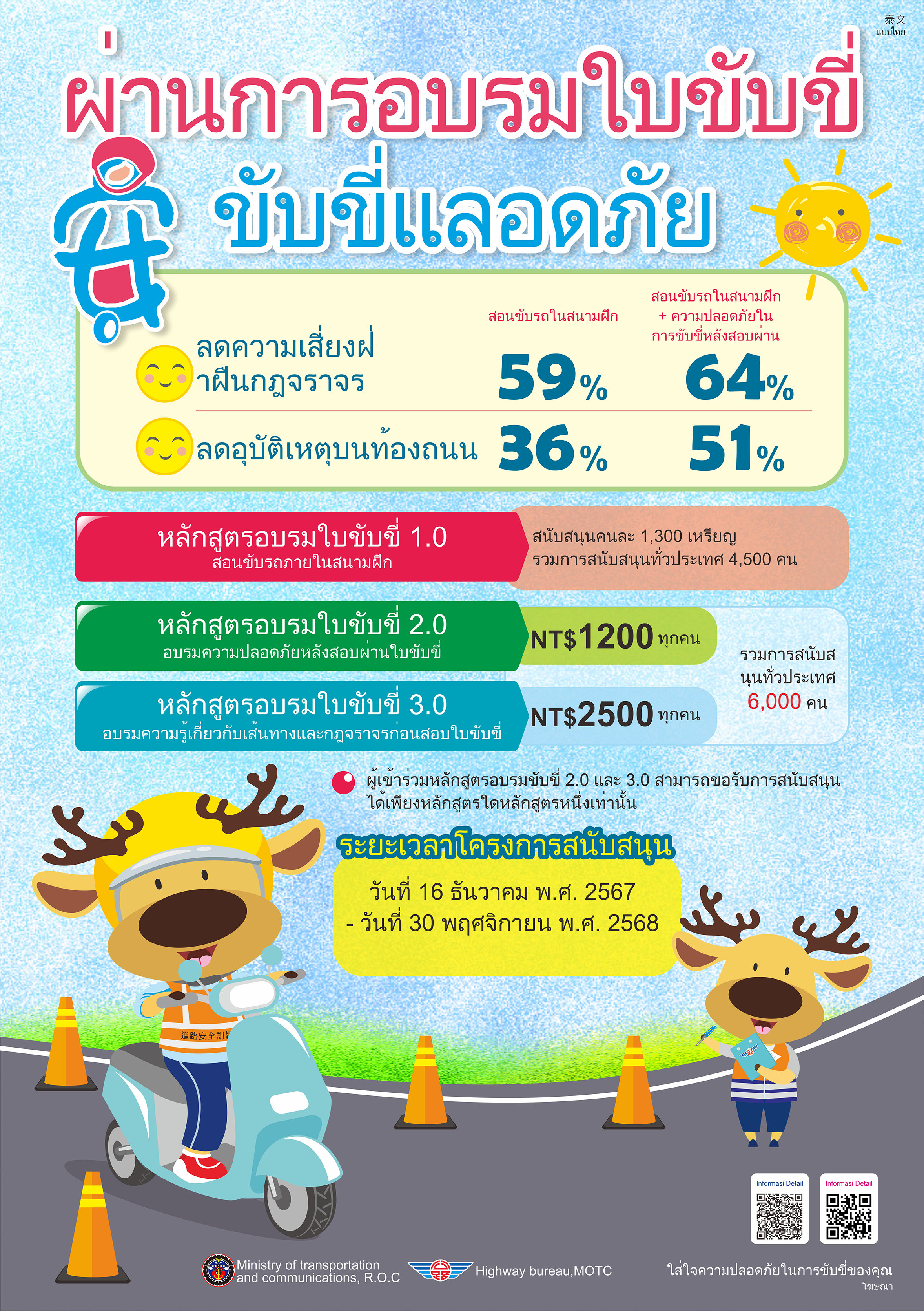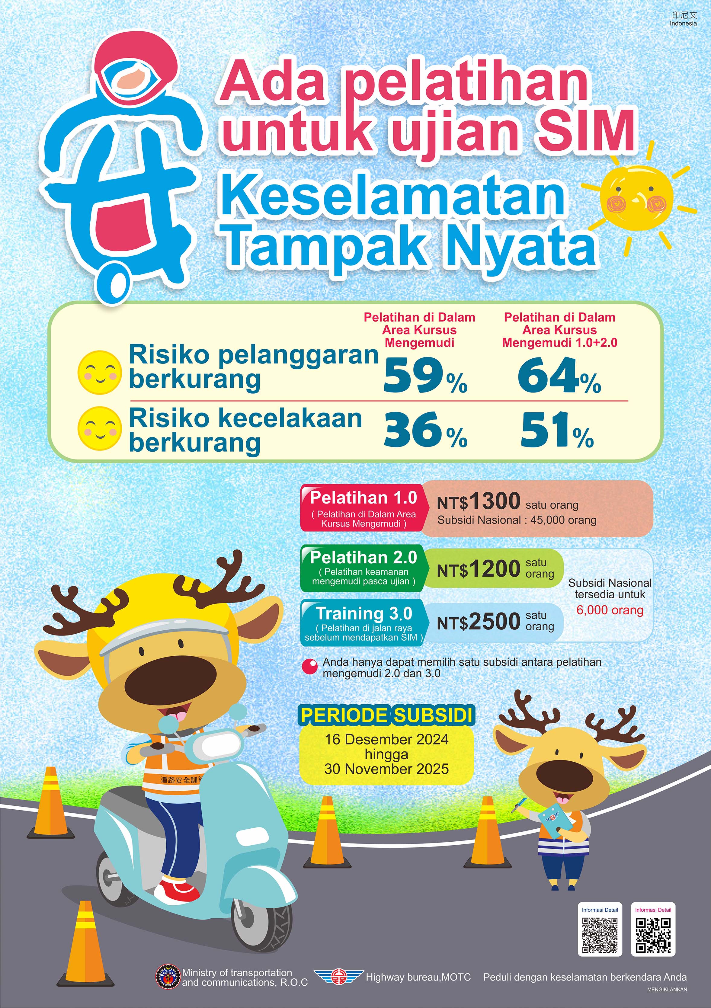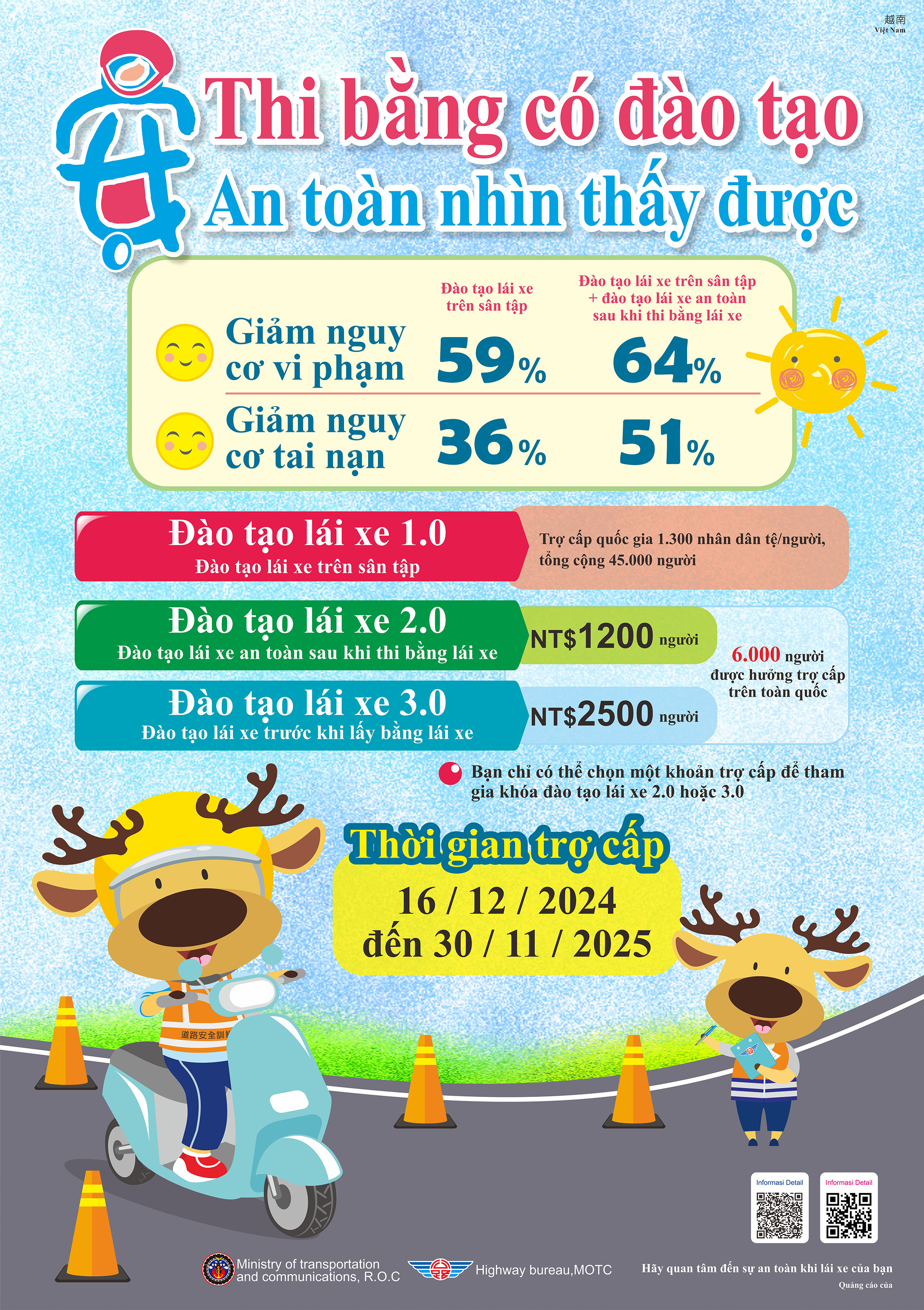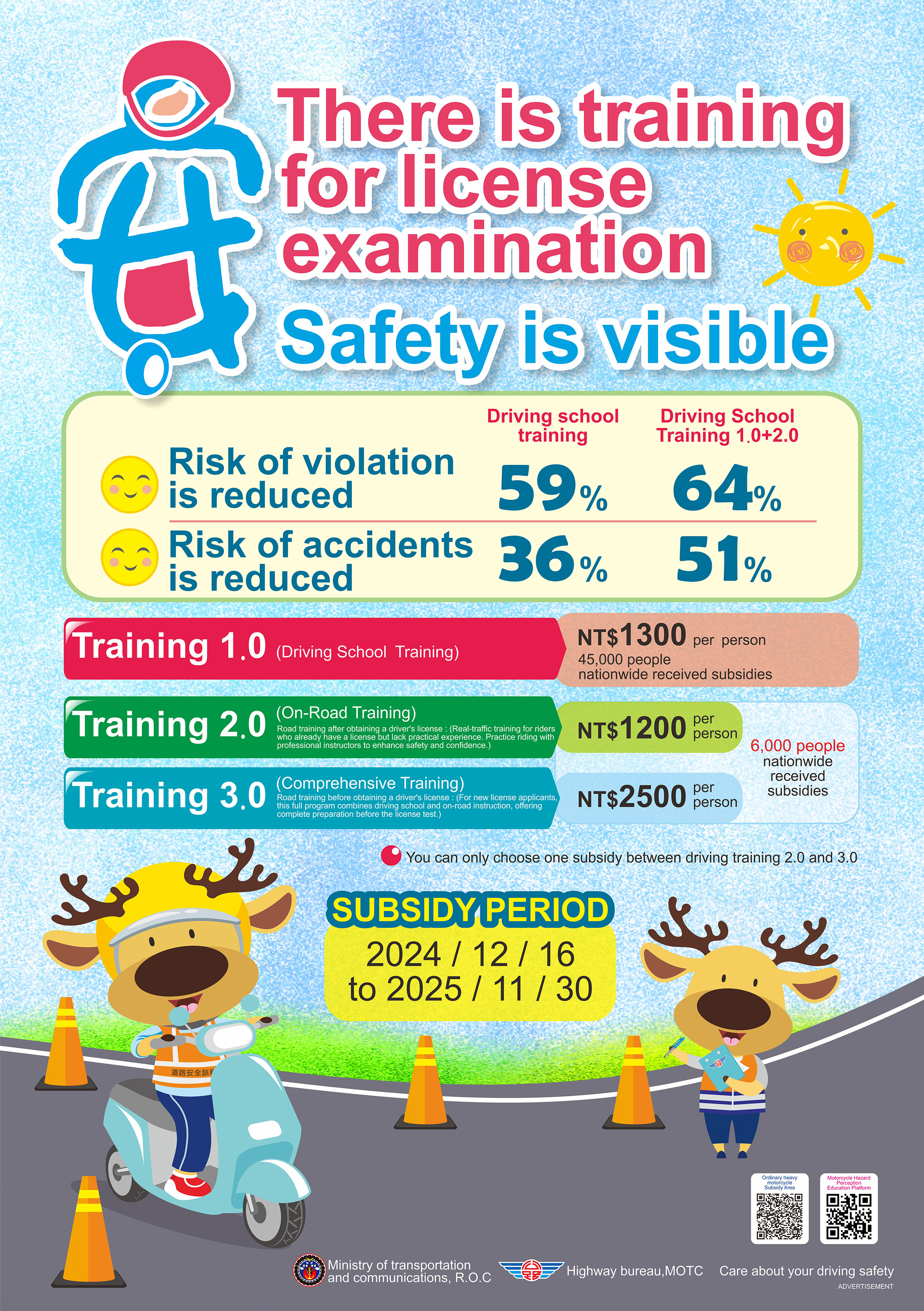 一、交通部公路局委託學術機構研究分析駕訓之成效,顯示經駕訓 者,可降低違規、肇事風險,機車駕訓確有成效。爰114年擴大辦理機車駕訓補助案,個人至機車駕訓班完成訓練並取得駕照者,補助金額新臺幣1,300元,名額45,000名,期間自113年12月16日至114年11月30日止,只要符合報考駕照資格者皆可申請。