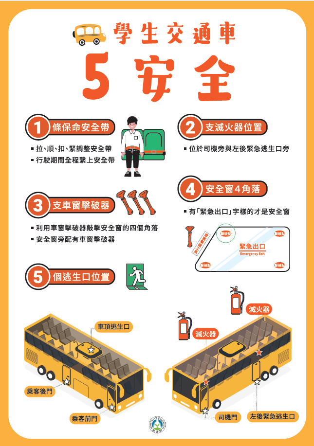 為提高學生搭乘交通車之安全意識及危機應變能力,教育部委請國立臺灣師範大學製作學生交通車教育訓練教材、教學影片及圖卡,供學校實施交通安全教育使用,以提升交通安全知能。
