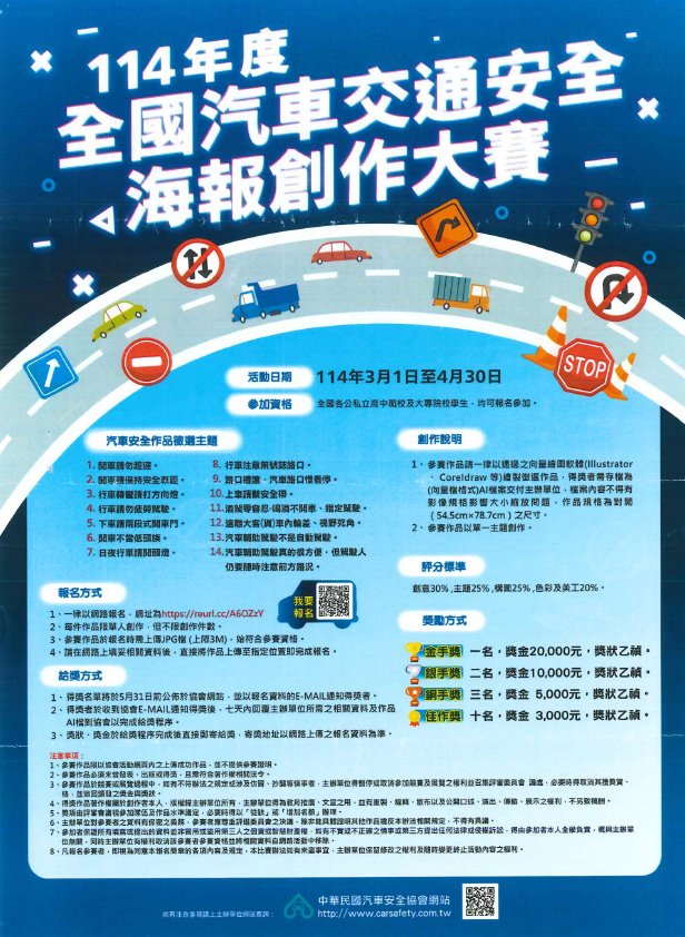 中華民國汽車安全協會「學生總動員」交通安全大競賽-114年度全國汽車交通安全海報創作大賽