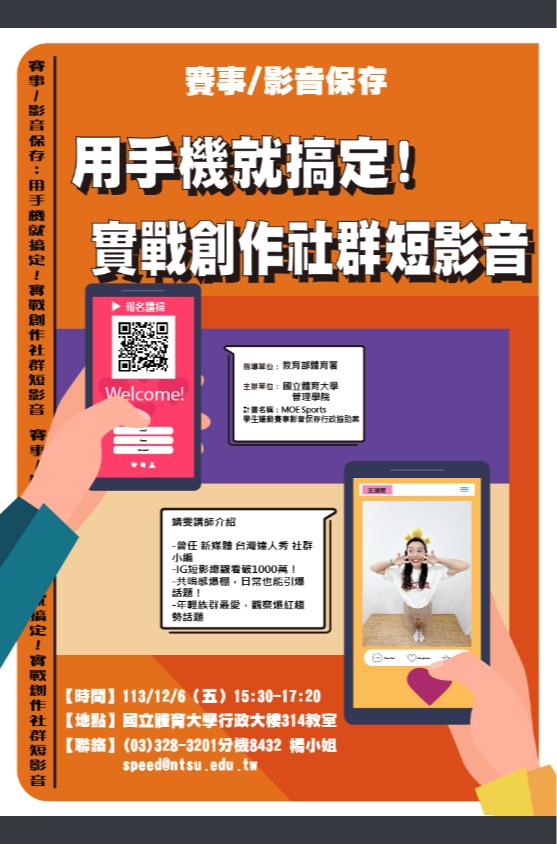 主旨:本校辦理「用手機就搞定!實戰創作社群短影音」課程活動,敬請轉知貴校教師及相關業務承辦人鼓勵學生踴躍報名參加並惠允公(差)假,請查照。