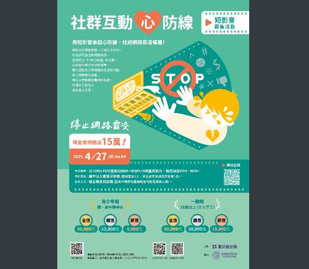二、為鼓勵青少年透過活動參與了解預防網路霸凌傷害的重要性,本會今年舉辦「社群互動”心”防線」停止網路霸凌短影音募集活動,即日起開始收件至民國114年4月27日止,邀請學生與民眾拍攝60-90秒直式短影音投稿,得獎作品可獲得獎金,青少年組首獎現金三萬元、一般組現金五萬元。活動辦法請參閱https://reurl.cc/1XRnzQ