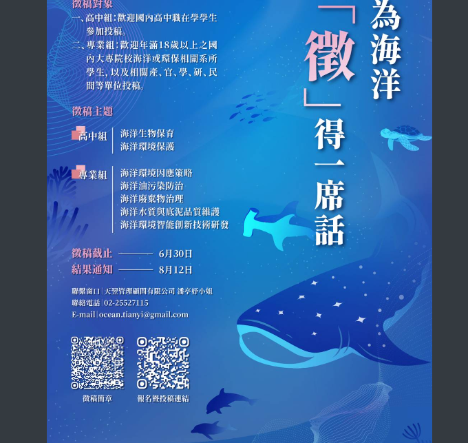 一、本研討會徵稿活動以「為海洋徵得一席話」為主軸,鼓勵來自國內高中職以上在校學生及各界海洋或環境領域專業人員投稿,一同為海洋發聲,讓世界看見您的文章,以筆書寫研究,以心守護海洋。 二、徵稿報名投稿時間為114年5月1日(星期四)起至6月30日(星期一)止,徵稿對象分別為:(一)「高中組」歡迎國內高中職在校學生投稿。(二)「專業組」歡迎年滿18歲以上之國內大專院校海洋或環保相關系所學生,以及相關產官學研民間等單位投稿。 三、徵稿主題:(一)「高中組」:海洋生物保育、海洋環境保護。(二)「專業組」:海洋環境因應策略、海洋油污染防治、 三、徵稿主題:(一)「高中組」:海洋生物保育、海洋環境保護。(二)「專業組」:海洋環境因應策略、海洋油污染防治、