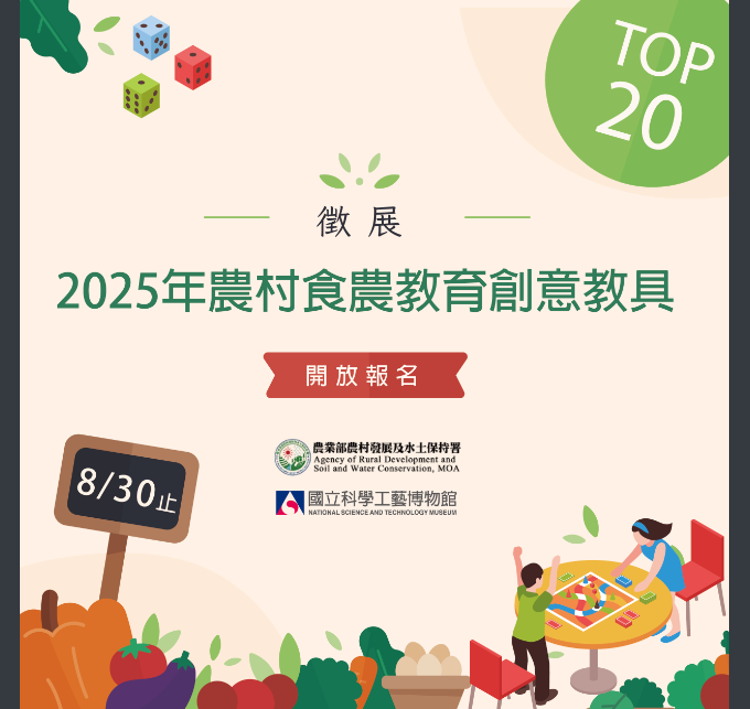 一、配合《食農教育法》頒布,為鼓勵大眾認識食農教育精 神,規劃辦理農村食農教育創意教具TOP20,徵選優秀作品作為展示及教具推廣使用,以達推動全民食農教育,強化飲食、環境與農業連結之目的。活動規劃於臺灣科學節期 間於館內辦理,並結合農村食農教育論壇及體驗活動,鼓勵大眾透過農村食農教育相關展示,認識永續在地農業與 飲食文化發展。