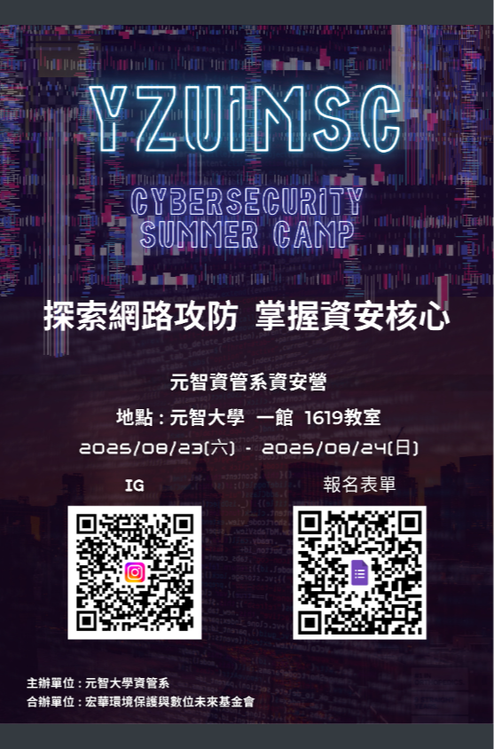 一、本校資管系擬於114年8月23日(星期六)至8月24日(星期日)辦理暑期資安體驗營,相關資訊及報名網頁詳如附件海報。