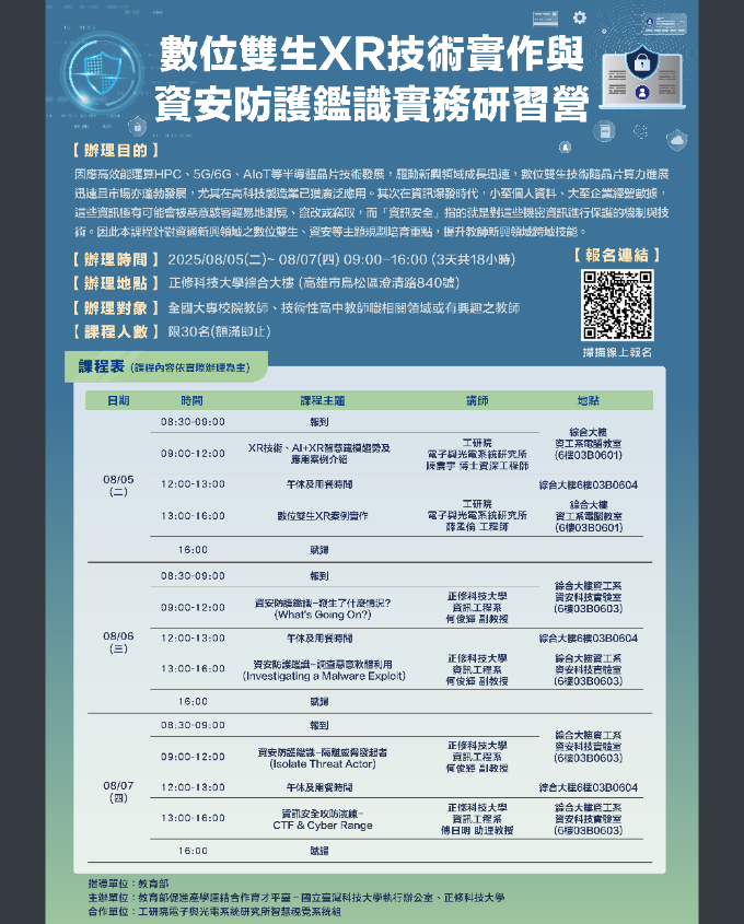 五、檢送「數位雙生XR技術實作與資安防護鑑識實務研習營」說明乙份,請依規定於期限內完成報名。