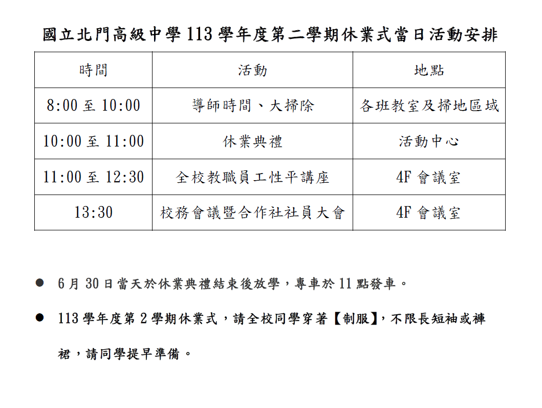 下表為113學年度第二學期休業式當日(6月30日)活動安排,