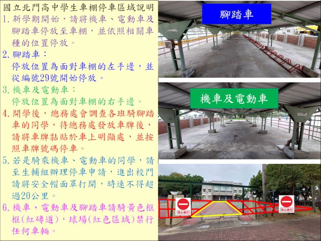 1.新學期開始,請將機車、電動車及腳踏車停放至車棚,並依照相關車種的位置停放。