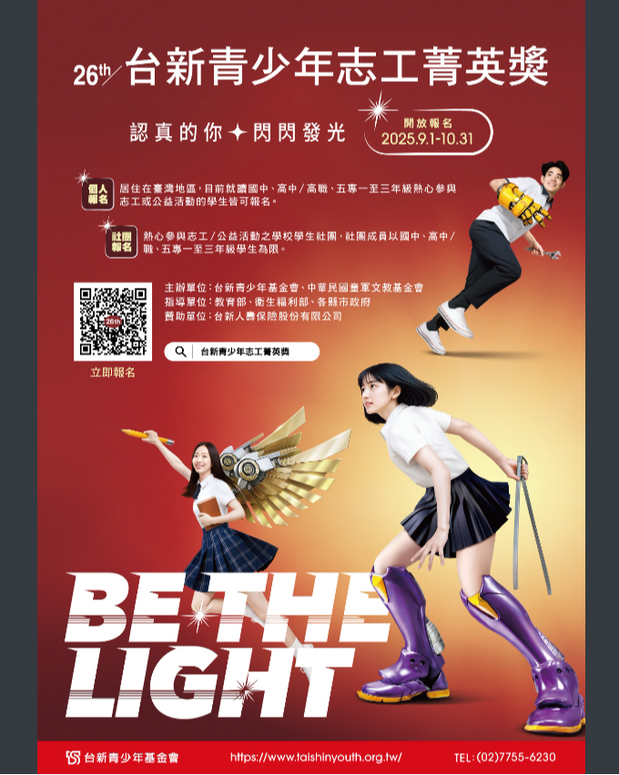 活動受理報名至114年10月31日止,獎項分為「個人服務」、「社團服務」2項類別,相關報名資訊請逕至該活動網站查詢:https://www.taishinyouth.org.