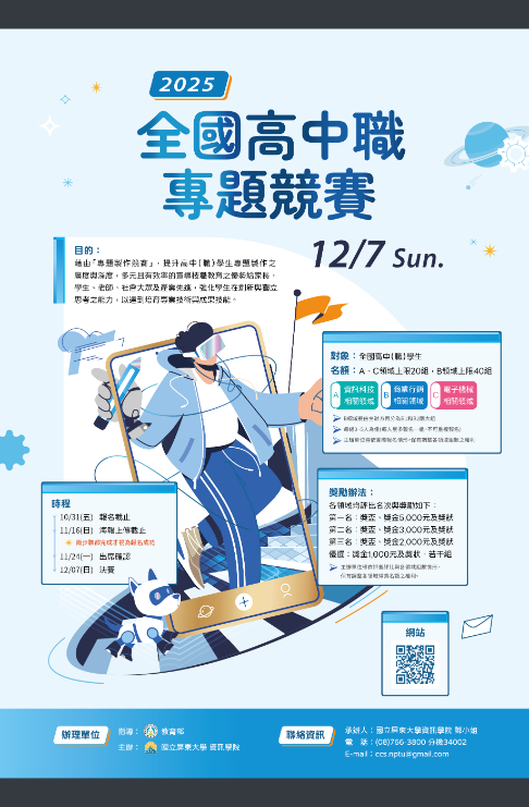 二、相關資訊如下:(一)參賽對象:全國高中(職)學生。(二)活動日期:114年12月7日(星期日)。(三)活動地點:本校屏商校區風雨球場(屏東市民生東路51號)。(四)報名流程:1、填寫報名表:即日起至114年10月31日(星期五)止。2、上傳競賽海報:114年11月16日(星期日)截止。3、完成以上兩步驟才可進行決賽,未在期限內上傳海報之小組即失去競賽資格。(五)活動網站:https://ccsnptu.wixsite.com/contest。