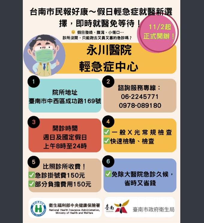 二、(一)中西區永川醫院為本市「假日輕急症中心」,專為發燒、腹痛、外傷、慢性病急性發作等輕症民眾設立~診所等級收費,看診方便、省時又省錢!輕急症病患不必 再跑急診排隊等候! (二)服務時間:每週日及國定假日上午8時至凌晨12時。 (三)服務項目:內(兒)科、外(骨)科。 (四)就診專線:06-2245771、0978089180。