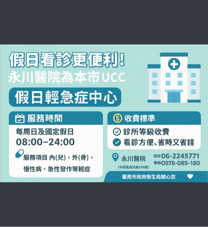 一、隨著社會生活型態改變,民眾於週日及國定假日期間的就 醫需求逐年增加,為解決本市急救責任醫院急診壅塞、分 流急重症病人有效獲得醫療照護,中西區永川醫院配合衛生福利部中央健康保險署開辦「週日及國定假日輕急症中 心(UCC)」門診,從11月2日開始實施,於假日上午8時至凌晨12時提供可近及便利性的輕急症服務,請市民善用 本資源。