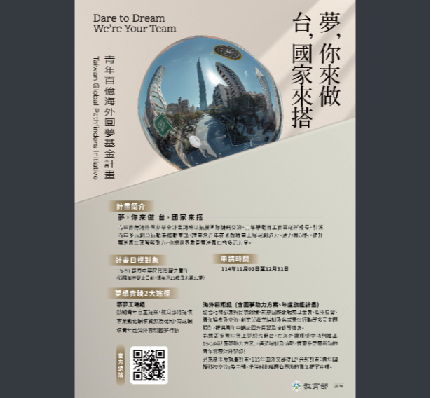 二、本計畫對象為本國15至30歲青年,分為築夢工場組與海外翱翔組(含年度旗艦計畫),第1梯次報名自114年11月3日起至12月31日,相關資訊可上計畫平臺查詢(https://twpathfinder.org/):