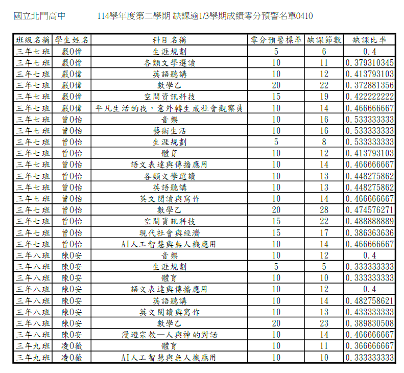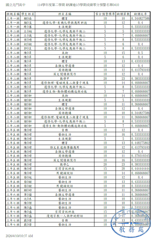 【校內試務】114學年度第二學期 缺課逾1/3學期成績零分預警名單0410